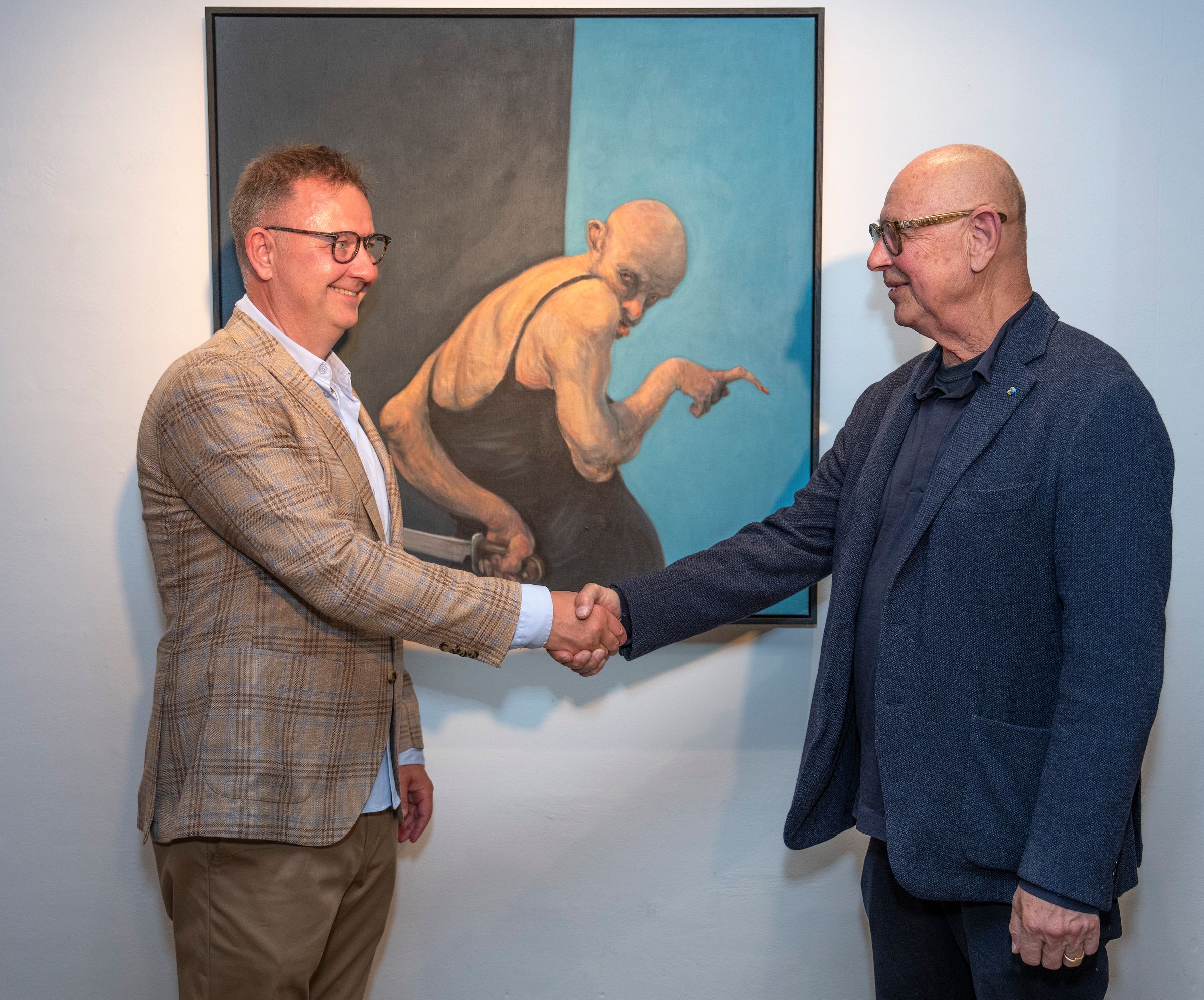 Billedet er fra åbningen af projektet, hvor direktør fra Trapholt, Karen Grøn og kunstner Michael Kvium, gik i dialog over uddykningen og Kviums kunstneriske univers.